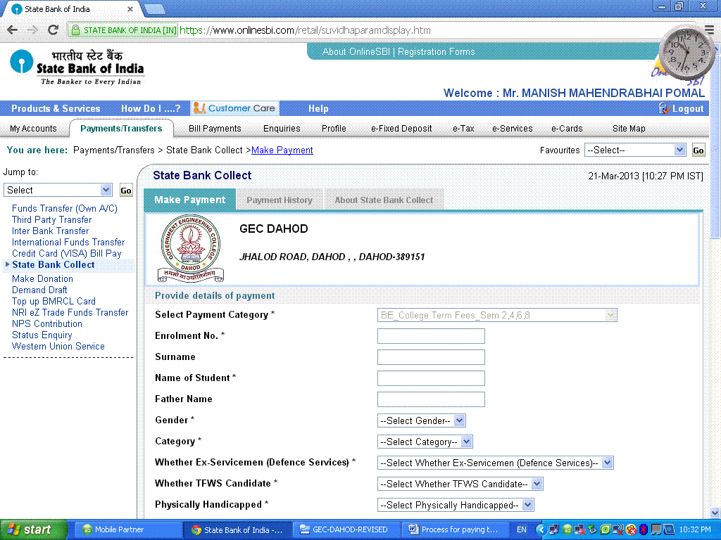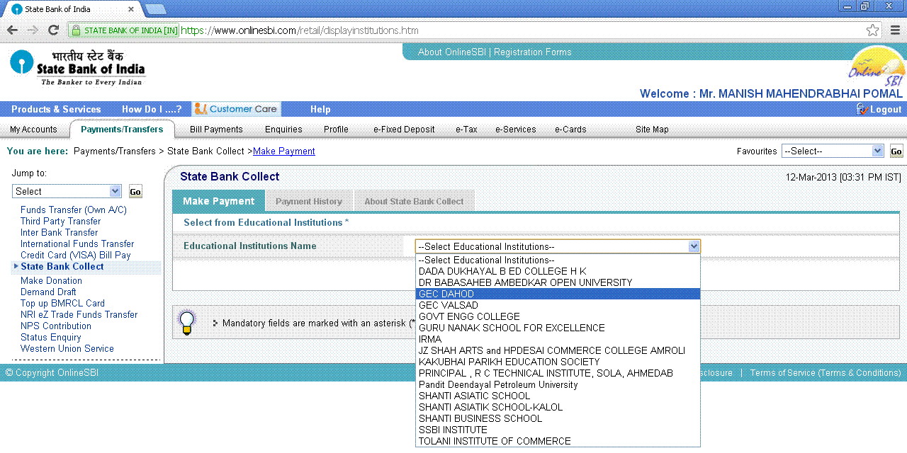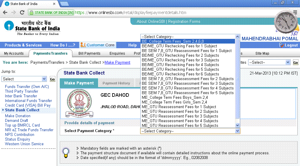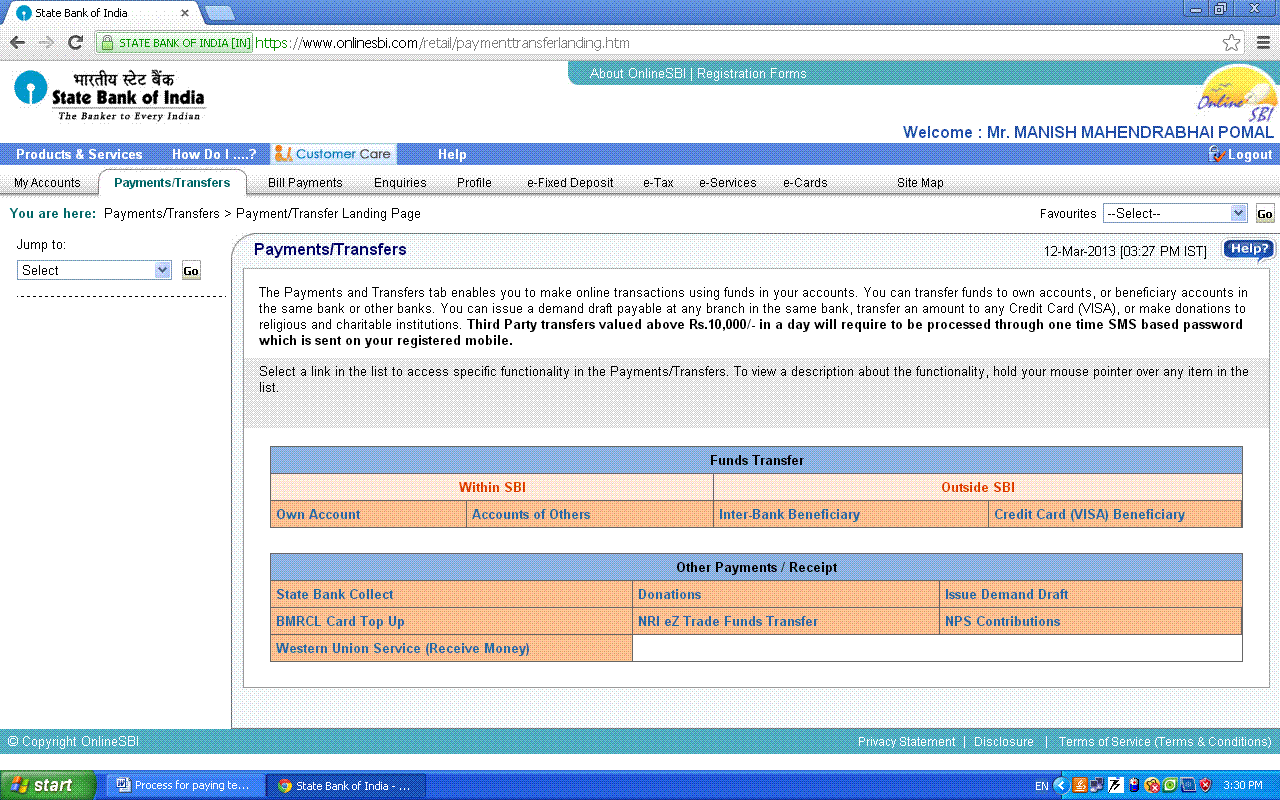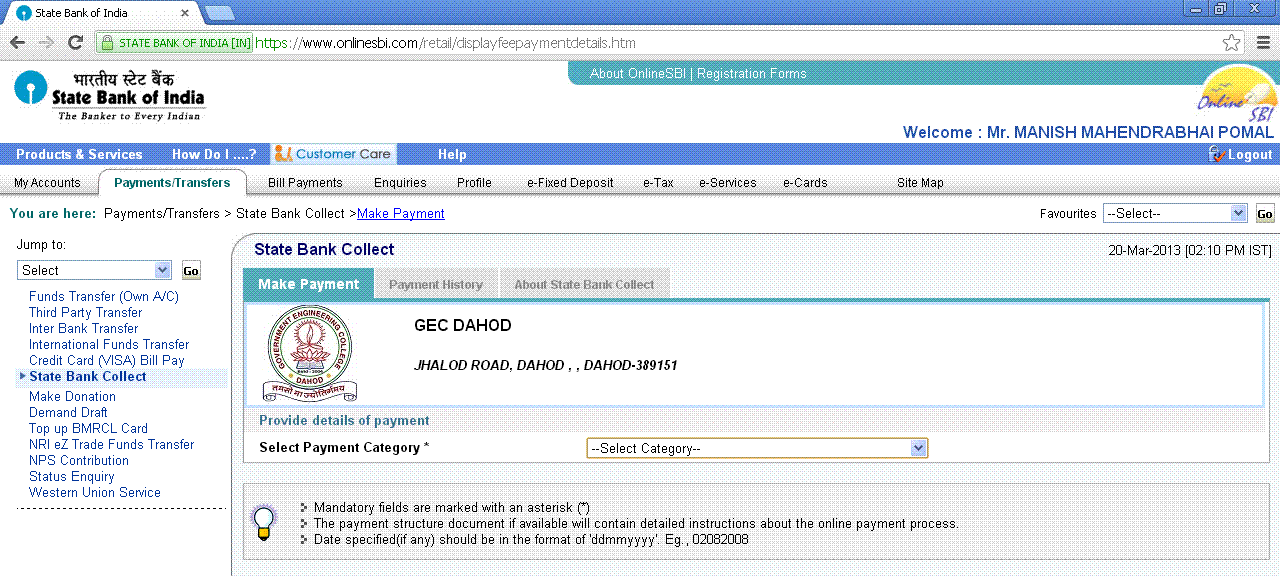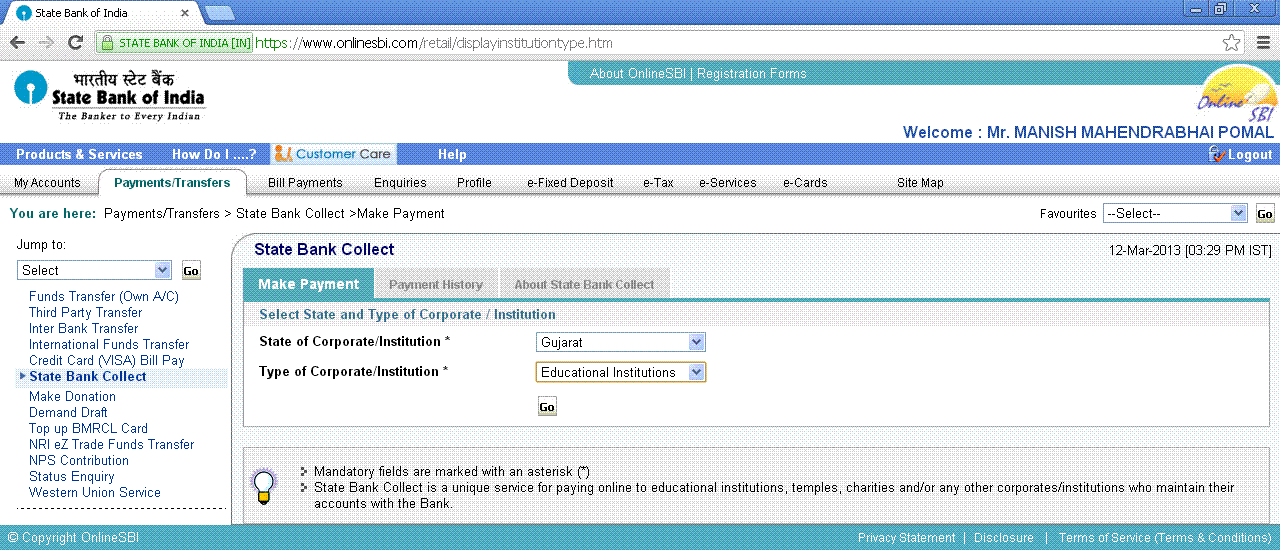 5. Click the Payment/Transfer tab as shown below.6. Under the Other Payments/Receipt part, click on State Bank Collect. |
