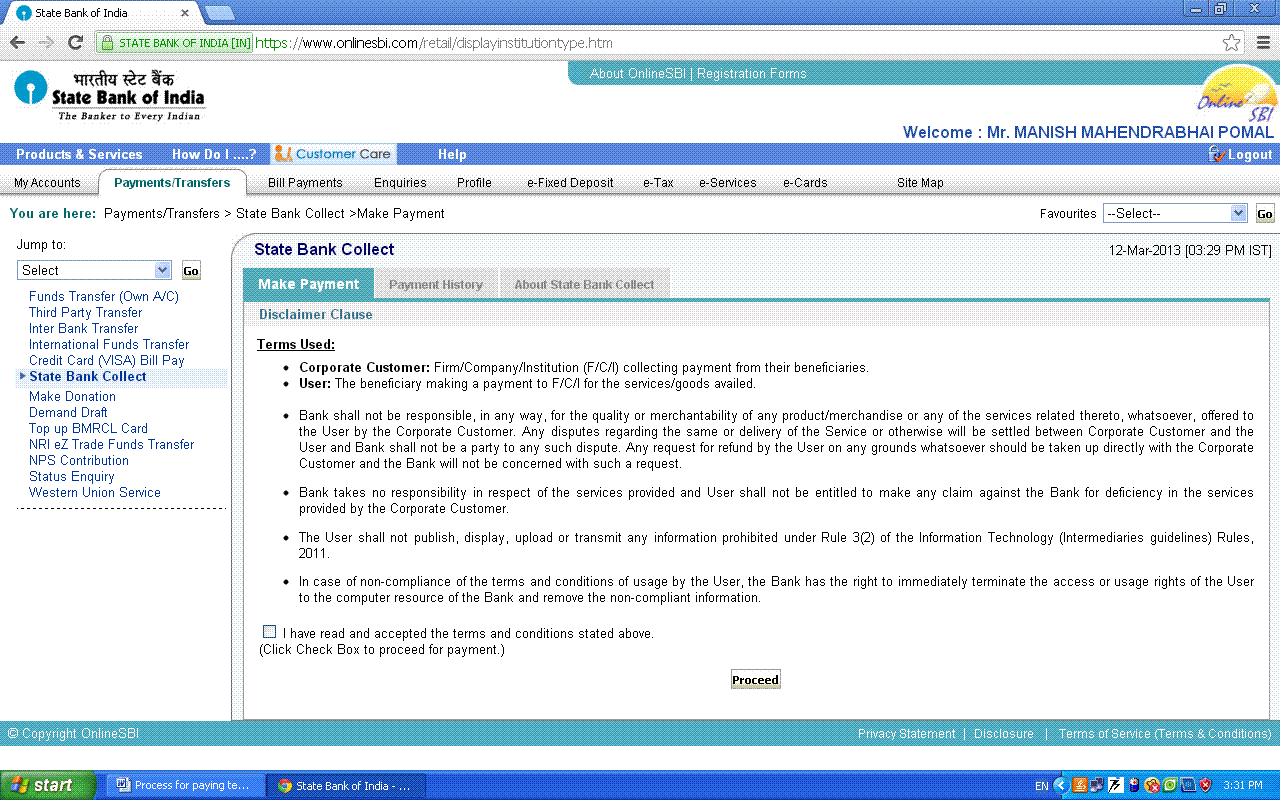 7. On the next page, under Make Payment tab, first click the checkbox to accept terms and conditions and then click on proceed command button. |